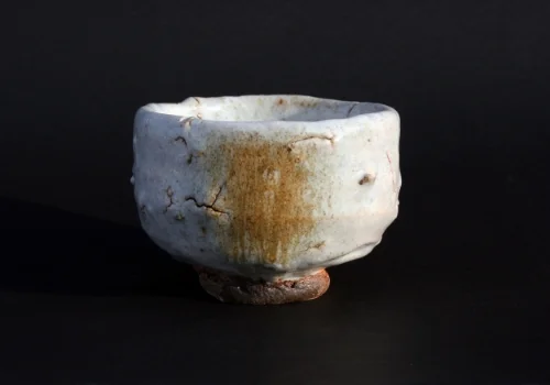 Tea bowl with heavy grit: wood-fired; beech ash 'nuka' glaze with incident oak ash run.