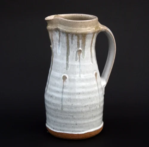 Jug with pressed pellets, 10 1/2": beech ash 'nuka' glaze with holly ash rim and holly ash runs.