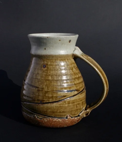 Large tankard: inside and rim down to handle ledge - soft 'eggshell' beech ash glaze; outside - oak ash based glaze.