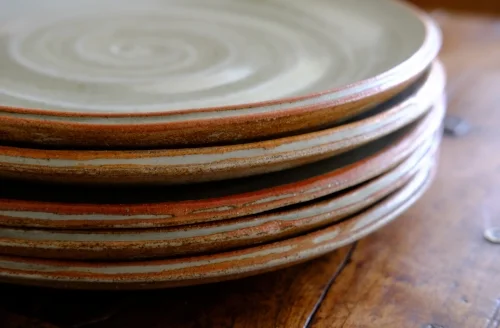 Five plates, 12" dia: white slip; 'eggshell' beach ash glaze.